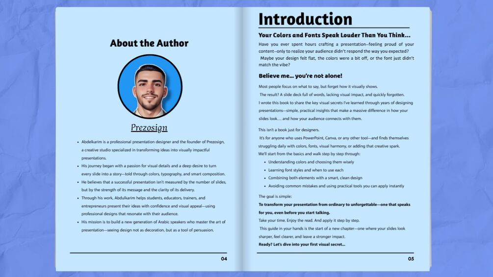 This book isn’t just a theoretical guide — it’s your practical companion on the journey to crafting presentations that speak for you… through colors and typography, even before the words. Whether you're a designer, a trainer, or an entrepreneur, you’ll discover how your slides can speak silently, delivering your message with smart, elegant visual impact.